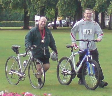 Progress through Barnett and into Finchley is hampered by increasing rainfall but undeterred, they all continue until David and Greg get lost. They know EXACTLY where they are, but also know that this is not where they are MEANT to be. After a short bit of discussion they resolve to buy a Mars bar (between them - last of the big spenders) and find the correct route that takes them into Temple Fortune and the finish in Hampsted Garden Suburbs. Arriving at the finish the above photo was taken by Thomas as Greg and David walk their bikes to the refreshment tent.